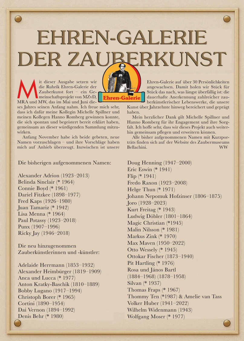 Die Biografien der hier aufgeführten Künstlerinnen und Künstler findet man ausführlich in der Zauber-Pedia: www.zauber-pedia.de Im Museum Bellachini befindet sich ebenfalls eine entsprechende Tafel.